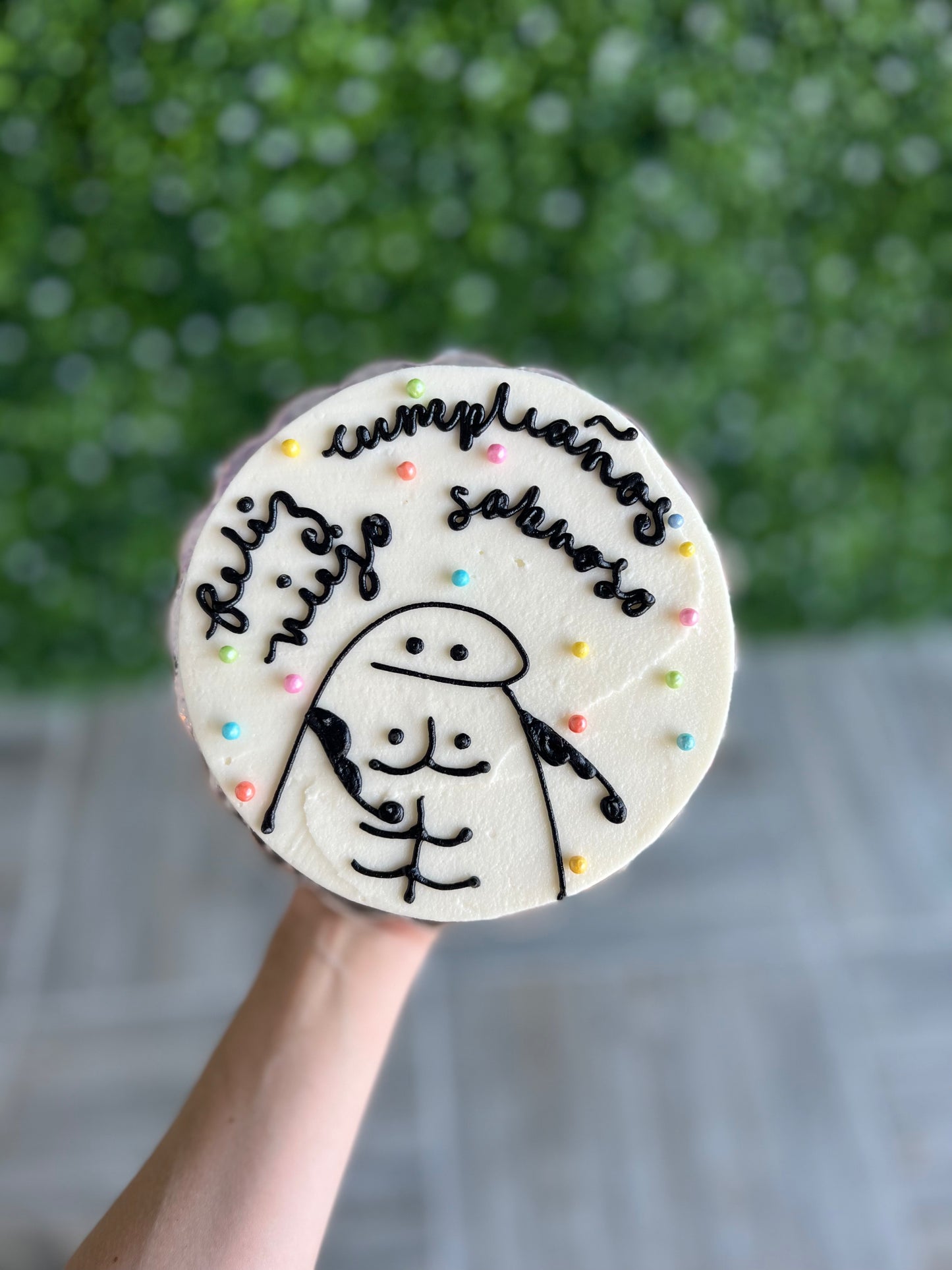 Pastel personalizado con el diseño del muñequito de WhatsApp y la frase que prefieras. La frase y figura debes describirlas en las notas de tu carrito de compra. Puede llevar corazones alrededor (rojos o rosas). (Cubierta blanca!!!)